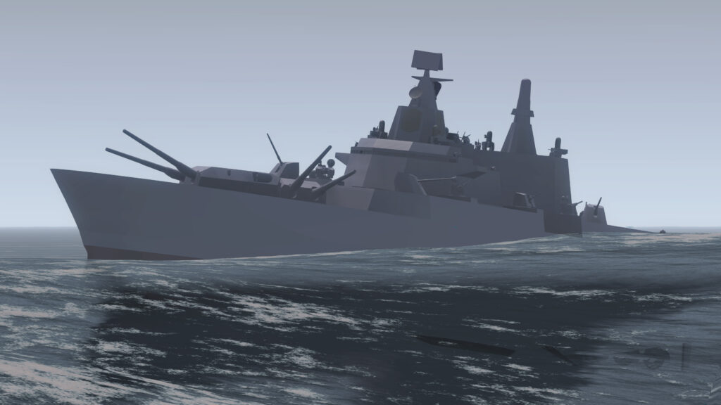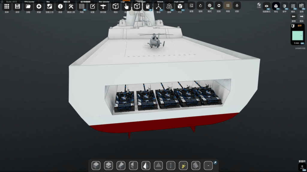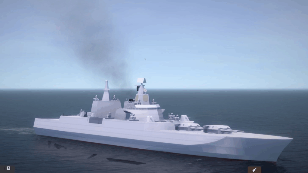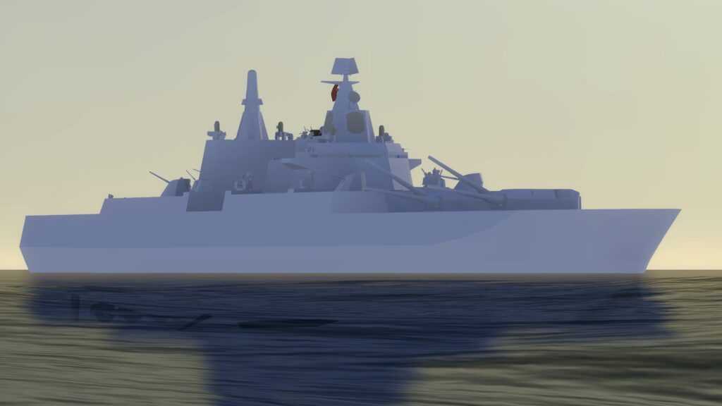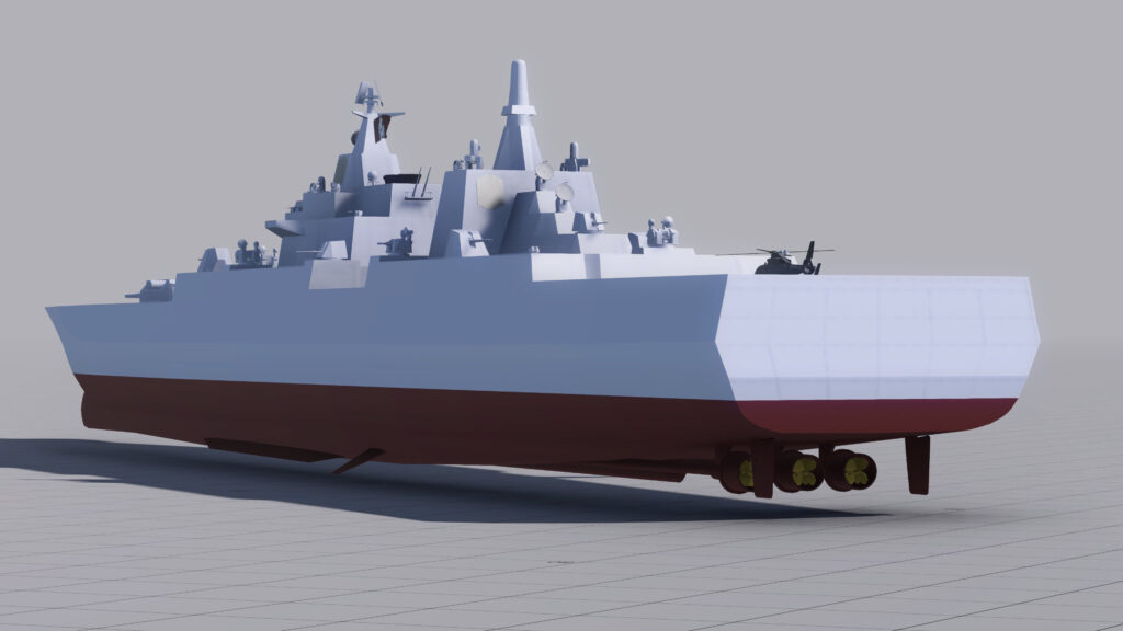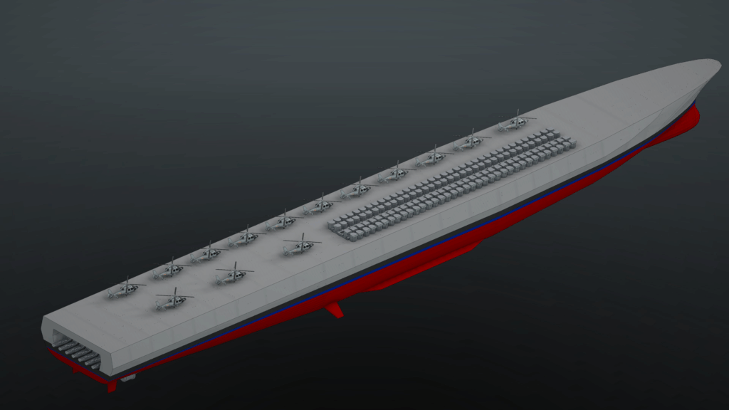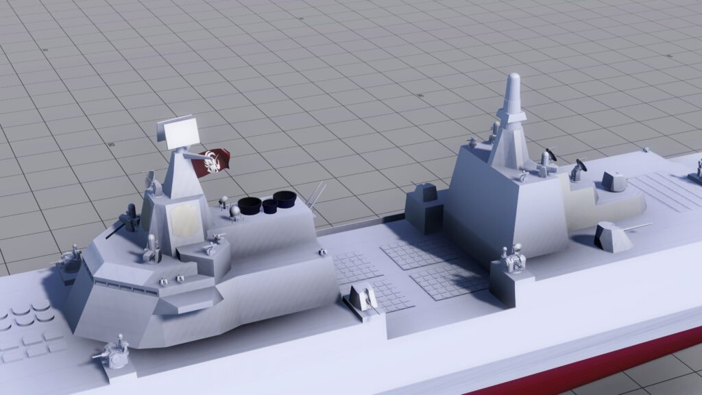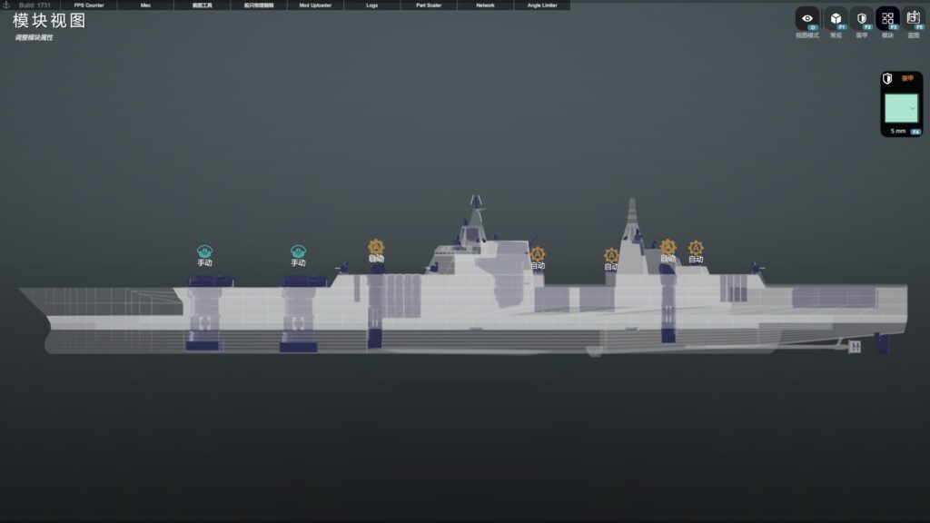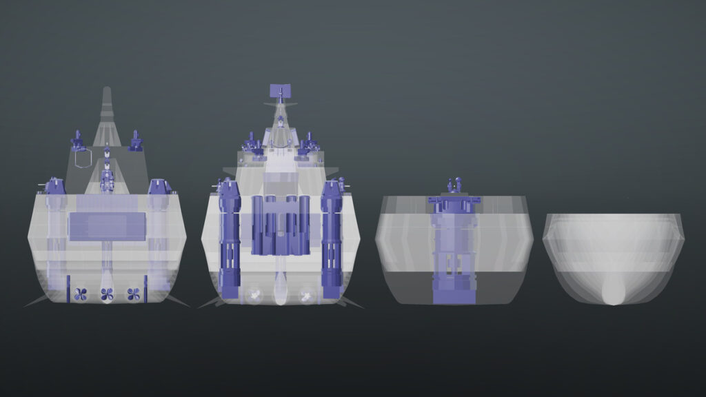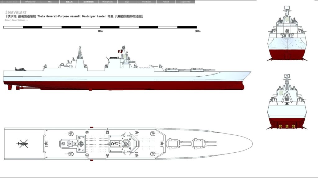Theia-class warship is a future-oriented multi-purpose naval platform, equipped with powerful air-defense and missile-defense systems, long-range anti-ship strike capability, and land-attack capability. It employs a hybrid nuclear-conventional propulsion system with a maximum speed of 31 knots, and is fitted with the Aegis radar system, a modular hull design, and a layered defense structure. The ship integrates stealth technology and a spacious hull, capable of accommodating a well deck and aviation facilities to support amphibious operations. Its diversified armament includes a large-caliber naval gun, primarily intended for shore bombardment but also capable of ship-to-ship combat when required, supplemented by long-range missiles, rapid-fire guns, and close-in defense systems. It avoids the use of super-firing arrangements, optimizing defensive integrity while simplifying hull lines and facilitating modular replacement. In operational roles, the vessel serves as the core of the fleet, while also providing long-range precision strike and amphibious support. The main gun functions as reserve firepower, able to precisely eliminate key targets under specific conditions. The name “Theia” is derived from Greek mythology, referring to the Titan goddess symbolizing radiance and creation—representing this warship as a herald of a new era in naval power. (Equipping a large-caliber main gun is more of a personal preference. Its practical role is usually shore bombardment support, though it can also be employed in ship-to-ship combat if necessary. The choice of the Bismarck’s 38 cm SK C/34 gun comes from the fact that the game’s default parts library already includes it, making it convenient without requiring additional mods. Its square, simple appearance, along with suitable dimensions and performance, makes it a solid option. Some science fiction works, such as certain warships in Gundam, also feature similar turret designs. The decision not to adopt a superfiring arrangement stems from the overall curved hull-line design, as well as considerations related to defense against armor-piercing shells—similar to postwar tanks reducing exposed surface area. The broad lower hull provides depth for layered defense. In terms of weapon system roles, the main gun serves as reserve heavy firepower under specific combat conditions, used for manually and precisely clearing key points. Its overall firing priority is not significantly higher than that of other weapon types, especially rapid-fire weapons and close-in defense systems.
