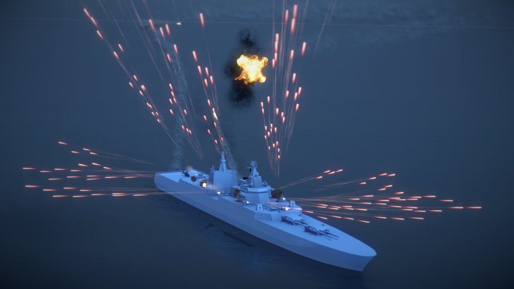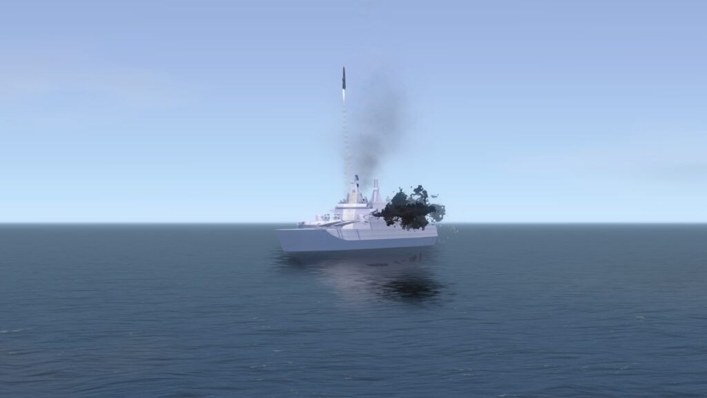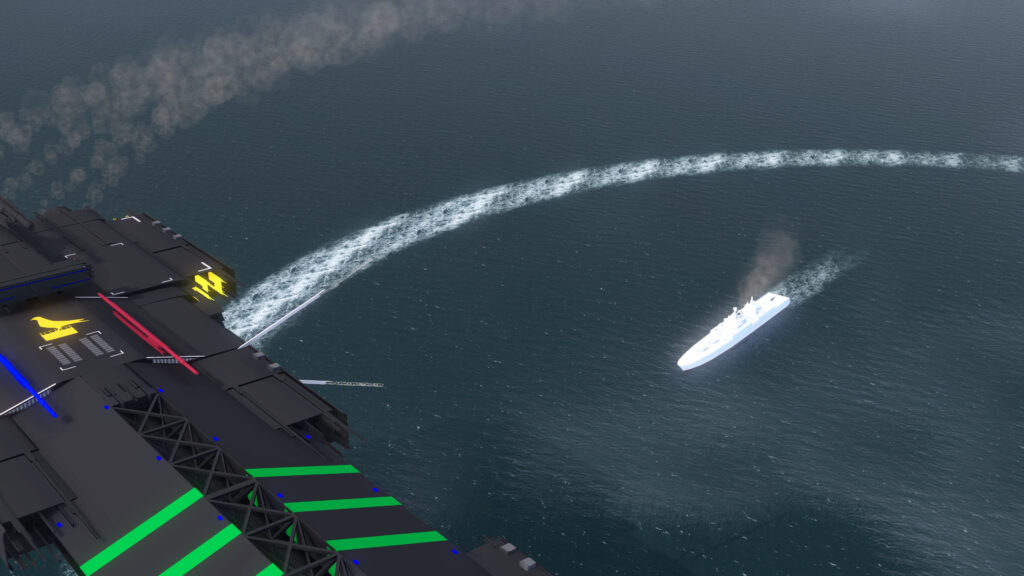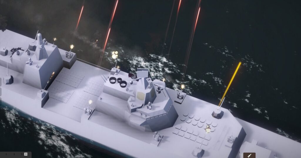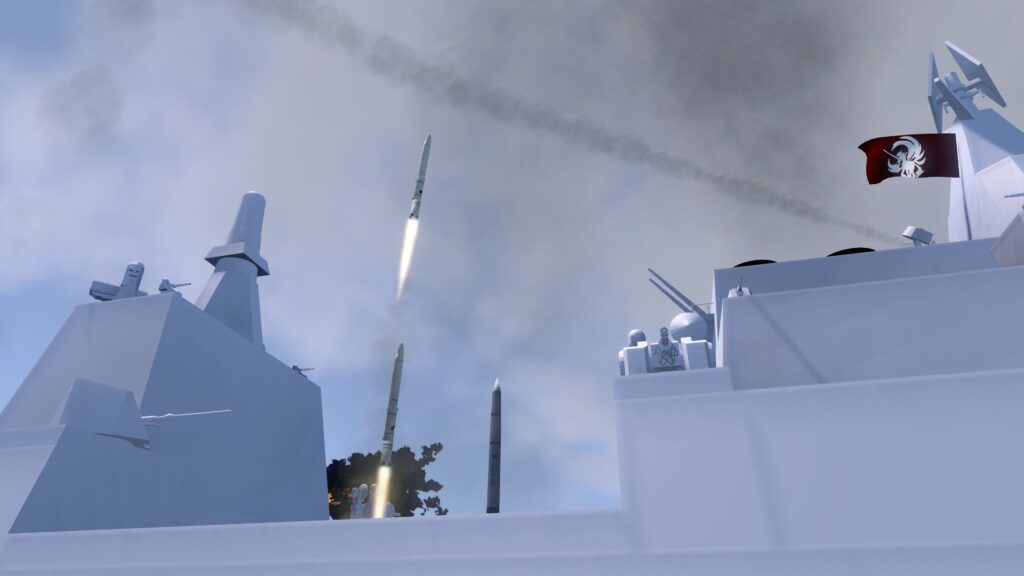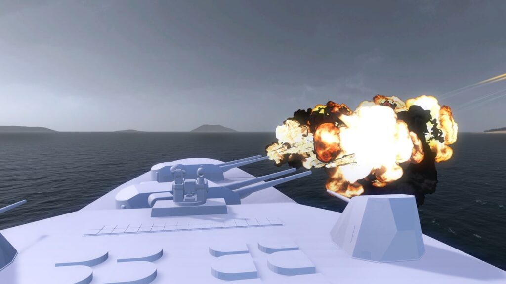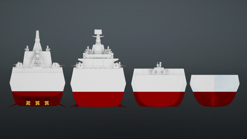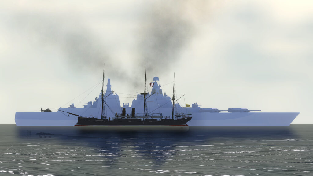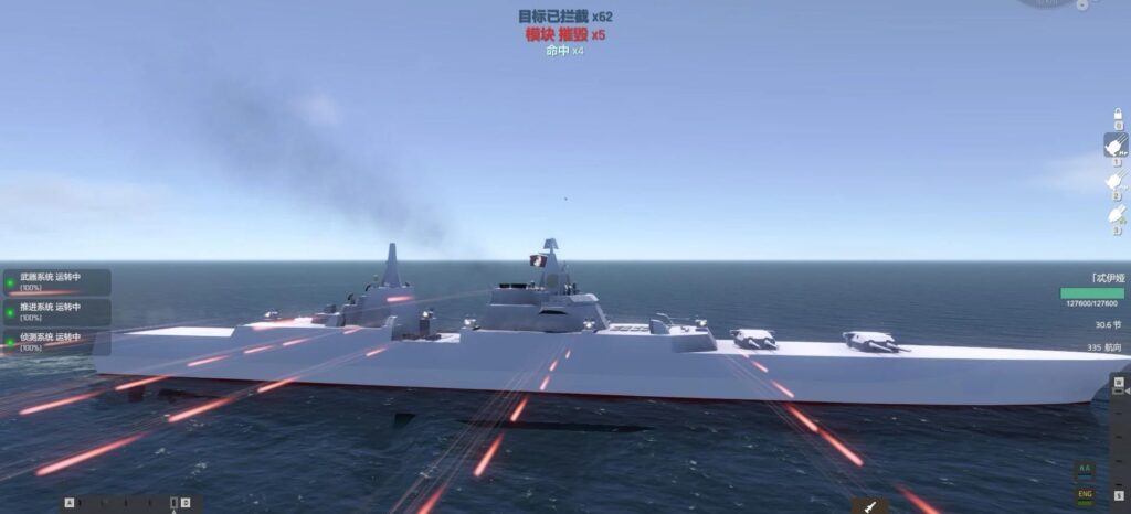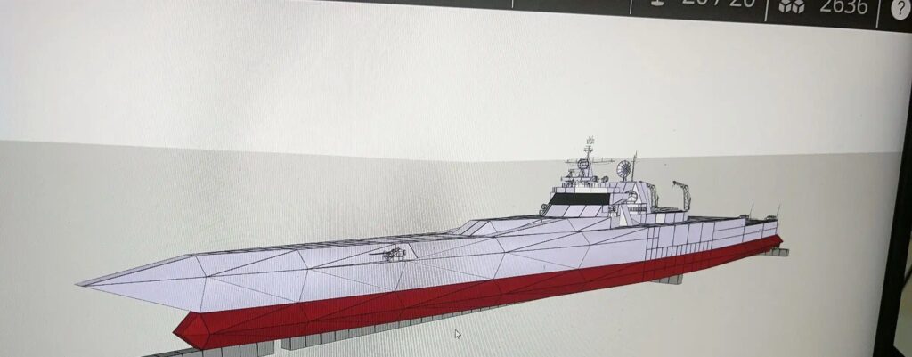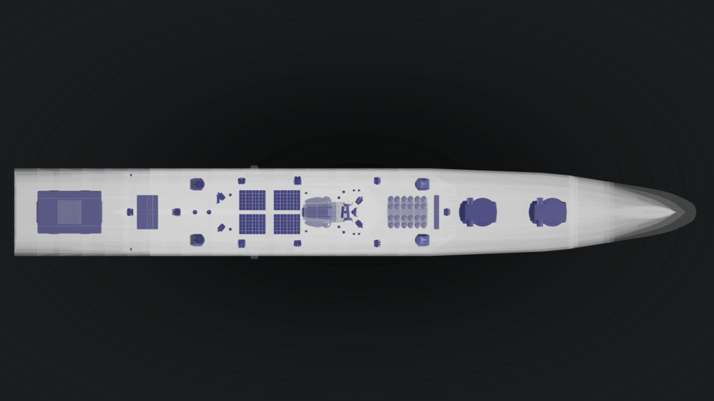 Theia-class warship is a future-oriented multi-purpose naval platform, equipped with powerful air-defense and missile-defense systems, long-range anti-ship strike capability, and land-attack capability. It employs a hybrid nuclear-conventional propulsion system with a maximum speed of 31 knots, and is fitted with the Aegis radar system, a modular hull design, and a layered defense structure. The ship integrates stealth technology and a spacious hull, capable of accommodating a well deck and aviation facilities to support amphibious operations. Its diversified armament includes a large-caliber naval gun, primarily intended for shore bombardment but also capable of ship-to-ship combat when required, supplemented by long-range missiles, rapid-fire guns, and close-in defense systems. It avoids the use of super-firing arrangements, optimizing defensive integrity while simplifying hull lines and facilitating modular replacement. In operational roles, the vessel serves as the core of the fleet, while also providing long-range precision strike and amphibious support. The main gun functions as reserve firepower, able to precisely eliminate key targets under specific conditions. The name “Theia” is derived from Greek mythology, referring to the Titan goddess symbolizing radiance and creation—representing this warship as a herald of a new era in naval power. (Equipping a large-caliber main gun is more of a personal preference. Its practical role is usually shore bombardment support, though it can also be employed in ship-to-ship combat if necessary. The choice of the Bismarck’s 38 cm SK C/34 gun comes from the fact that the game’s default parts library already includes it, making it convenient without requiring additional mods. Its square, simple appearance, along with suitable dimensions and performance, makes it a solid option. Some science fiction works, such as certain warships in Gundam, also feature similar turret designs. The decision not to adopt a superfiring arrangement stems from the overall curved hull-line design, as well as considerations related to defense against armor-piercing shells—similar to postwar tanks reducing exposed surface area. The broad lower hull provides depth for layered defense. In terms of weapon system roles, the main gun serves as reserve heavy firepower under specific combat conditions, used for manually and precisely clearing key points. Its overall firing priority is not significantly higher than that of other weapon types, especially rapid-fire weapons and close-in defense systems.